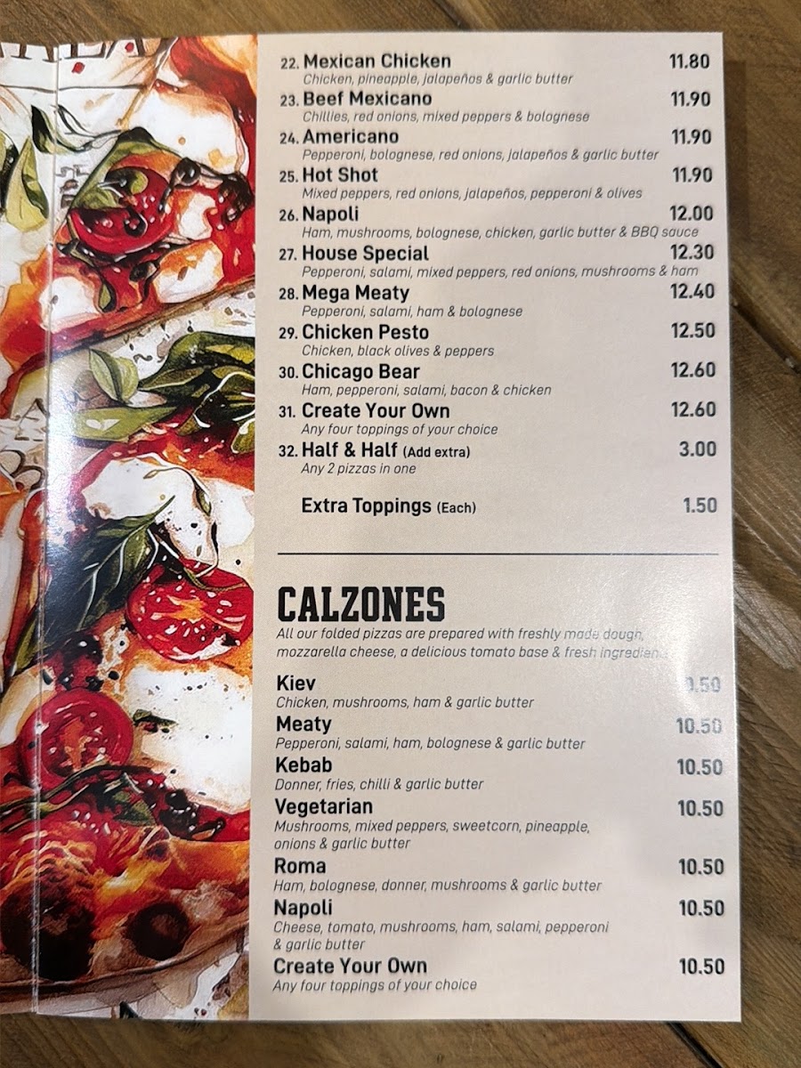 Ham, Bolognese, Dönner, Mushrooms and Garlic Butter. Take a bite of Rome with this eclectic mix of ham, Bolognese sauce, donner meat, and mushrooms.