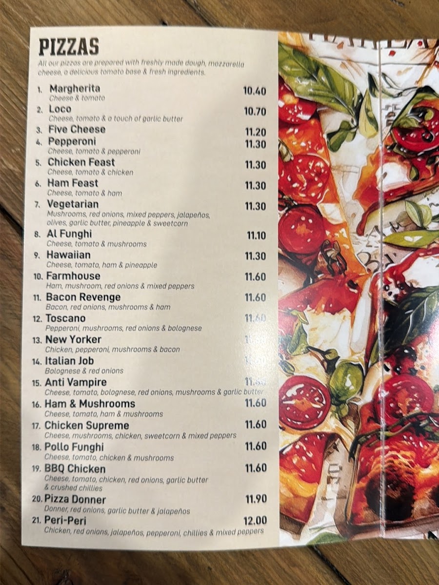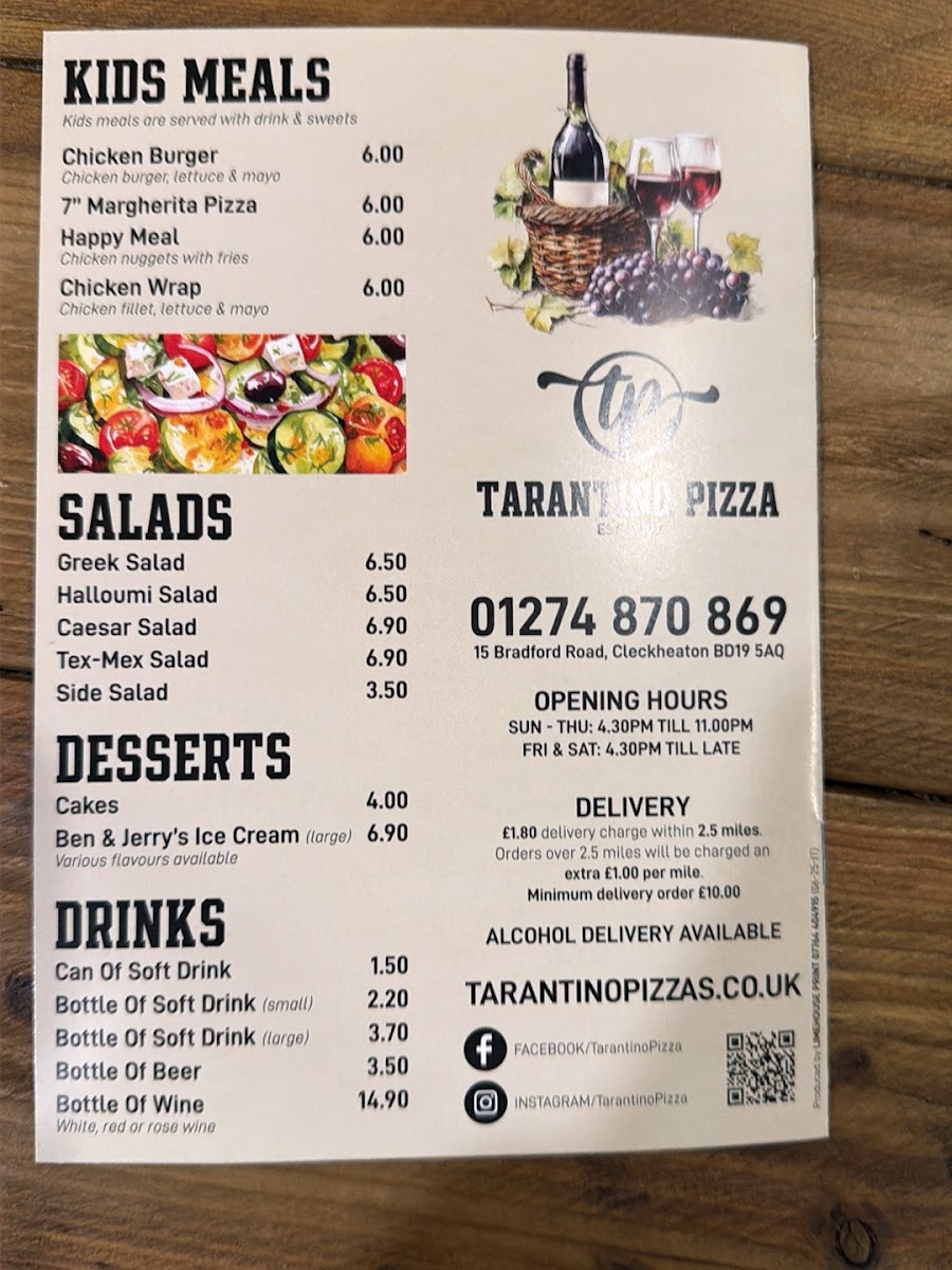 The menu at Tarantino + Pizzas Ltd offers a wide variety of delicious options, catering to every taste. For pizza lovers, the selection includes classics like Margherita and Pepperoni, as well as unique choices such as Loco and the indulgent Five Cheese pizza. Garlic bread fans can enjoy several variations, including Original Garlic Bread, Garlic Bread Pomodoro, and the flavorful Garlic Bread Tex-Mex. Pasta options range from the hearty Spaghetti Bolognese to the creamy Penne Chicken Alfredo and fresh Penne Pesto with Chicken. Calzone enthusiasts can choose from fillings like Meaty, Kiev, or the vegetarian-friendly Vegetarian Calzone. For those craving something fried, the Chicken Parmesan or the spicy Hot Shot Parmesan offers a satisfying treat. The charcoal-cooked kebabs, including Chicken Kebab and Lamb Shish Kebab, bring a taste of Persia, cooked to perfection. The burger menu features a variety of options such as the Cheese Burger and the flavorful Jack Daniels Burger. If you're in the mood for something Mexican, the Zinger Burrito or Chicken Fajitas are excellent choices. For wraps, the Crispy Chicken Wrap and Donner Wrap are fan favorites. Side dishes like Cheesy Chips and Curly Fries perfectly complement any meal. Kids will love the Happy Meal or a fun 7" Pizza Margherita, paired with a drink and a surprise treat. Finally, to satisfy your sweet tooth, desserts like Ben & Jerry's Ice Cream and Cakes and Cream are a perfect finish to any meal.