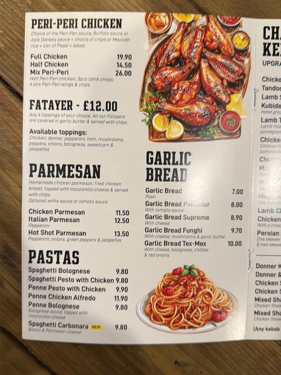 Unveil a world of flavors with our customizable Fatayer, a Middle Eastern speciality. Whether you opt for meaty, veggie, or a mix of both, rest assured each bite will be bursting with garlicky goodness and complemented by a side of crispy chips. Choose any 4 toppings to make your Fatayer uniquely yours. All our Fatayers are generously covered in garlic butter and served with a side of chips. Available toppings include Chicken, Donner, Pepperoni, Ham, Mushrooms, Peppers, Onions, Bolognese, Sweetcorn, and Jalapenos.