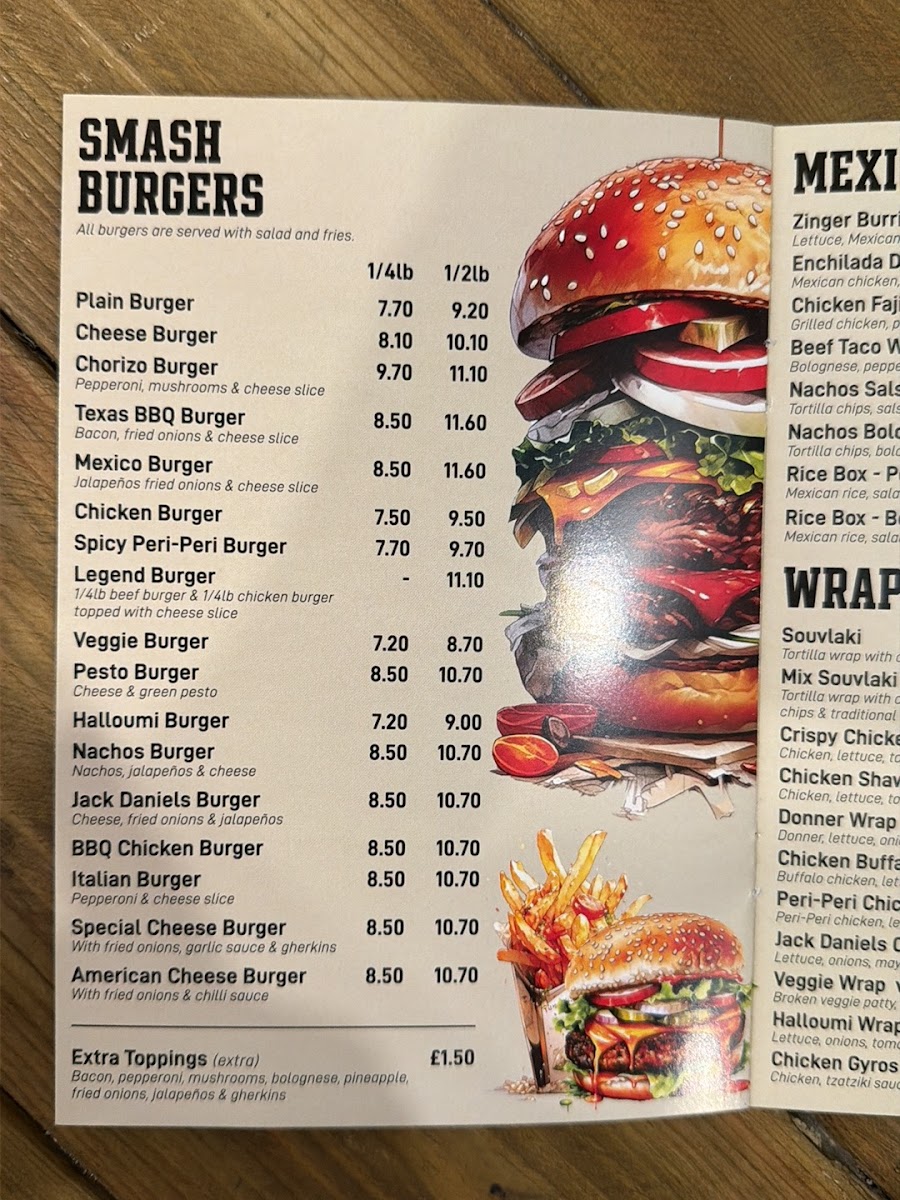 Half-pound Beef Burger with Mozzarella, Fried Onions, Jalapeños, all in a Pizza Dough! The name says it all—a flavor explosion featuring a half-pound beef patty, mozzarella, and spicy jalapeños, all wrapped up in pizza dough.